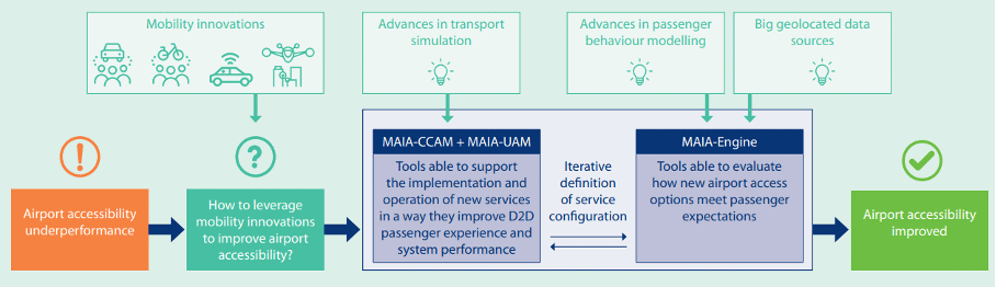 MAIA project has for primary mission to develop a comprehensive set of data analytics and modeling tools that will support the design and implementation of multimodal airport access solutions. These solutions are centred around two groundbreaking passenger mobility innovations on ground and airborne: shared autonomous vehicle and unmanned aerial vehicle fleets. MAIA develops a toolkit to monitor and predict passenger behaviour shifts resulting from these innovations, optimize vehicle dispatching during multimodal disruptions, and recommend strategic vertiport locations. The project aims to maximize the contributions of these mobility innovations to the European aviation sector’s competitiveness and sustainability.