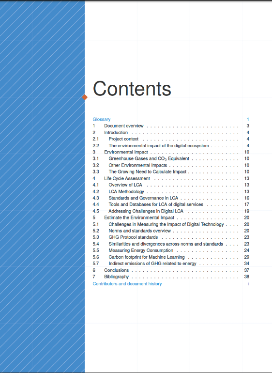 Overview of the current state of the art regarding the environmental impact​ of digital technologies, with a specific focus on assessment methodologies, key standards, and measurement​ tools.