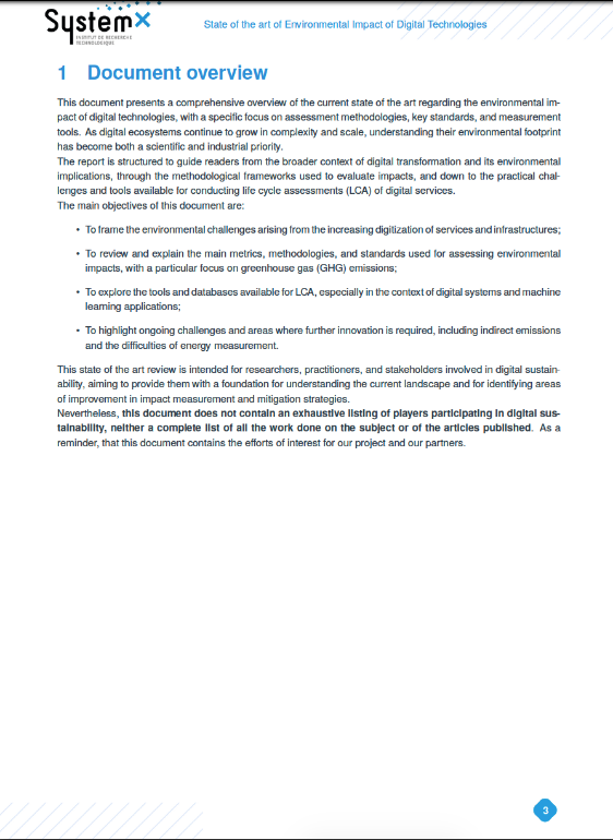 This document presents a comprehensive overview of the current state of the art regarding the environmental impact​ of digital technologies, with a specific focus on assessment methodologies, key standards, and measurement​ tools. As digital ecosystems continue to grow in complexity and scale, understanding their environmental footprint​ has become both a scientific and industrial priority.​ The report is structured to guide readers from the broader context of digital transformation and its environmental​ implications, through the methodological frameworks used to evaluate impacts, and down to the practical challenges​ and tools available for conducting life cycle assessments (LCA) of digital services.​
