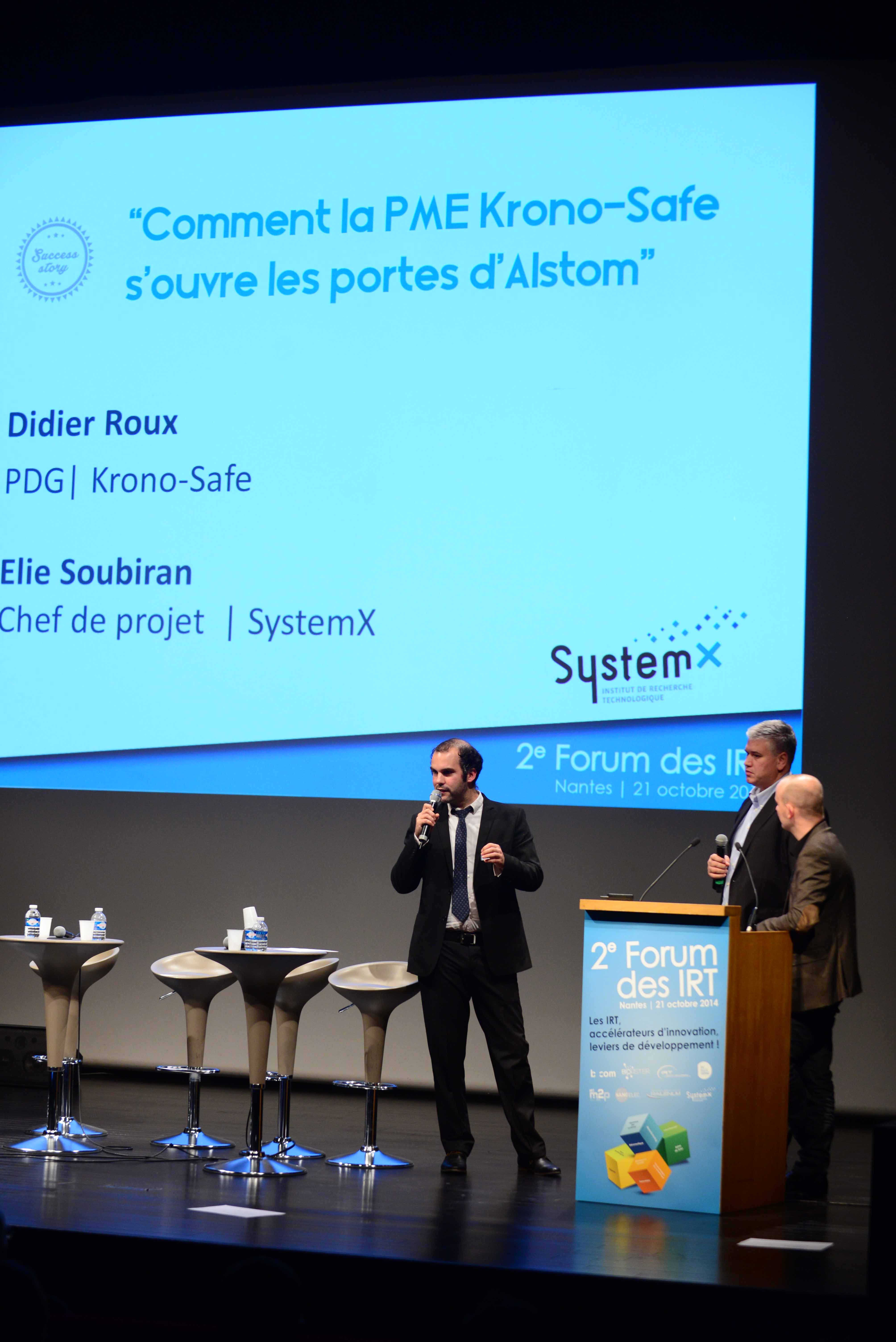 Au cours de la plénière se sont ensuite succédées tables-rondes, interviews et success stories. Elie Soubiran, chef de projet FSF – mis à disposition par Alstom, et Didier Roux, CEO de Krono-Safe, ont témoigné de la valeur ajoutée de l’IRT SystemX dans la collaboration des grands groupes et des PME.